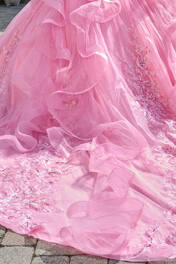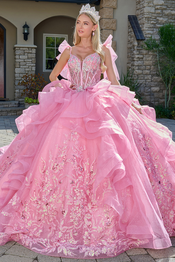Quinceanera ball gown features delicate spaghetti straps adorned with small glittering bows. The sheer V-neckline corset bodice, crafted from glitter tulle, is lavishly embellished with intricate embroidery, shimmering beads, sequins, and radiant jewels. A classic Basque waistline gives way to a voluminous skirt, designed with cascading ruffle layers for dramatic movement. The back of the skirt extends into a train.