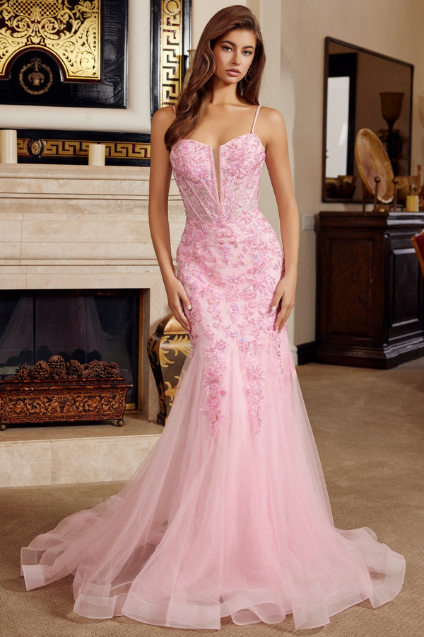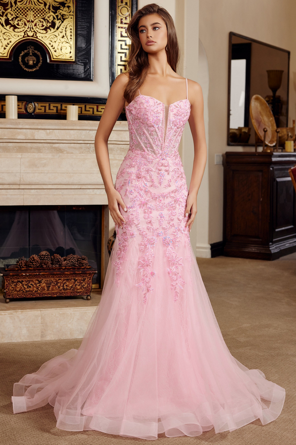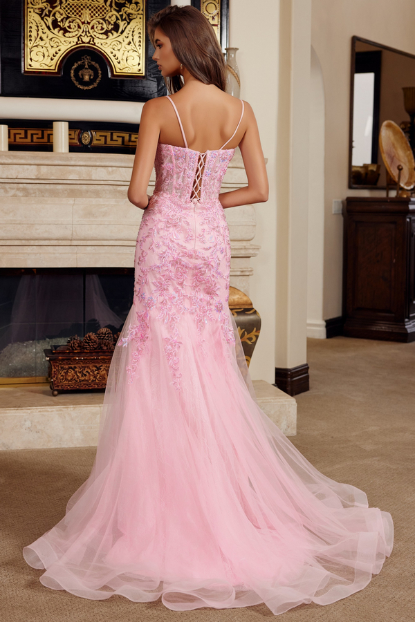 TRUMPET SILHOUETTE TULLE MATERIAL PLUNGING SEMI SWEETHEART BUSTLINE WITH SPAGHETTI STRAPS AND A LACE UP BACK.