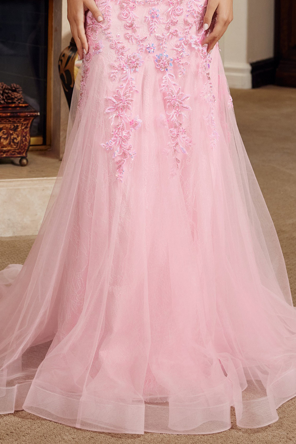 Color: PINK Size:- Plunging Neck Bead Sequin Embellished Trumpet Gown