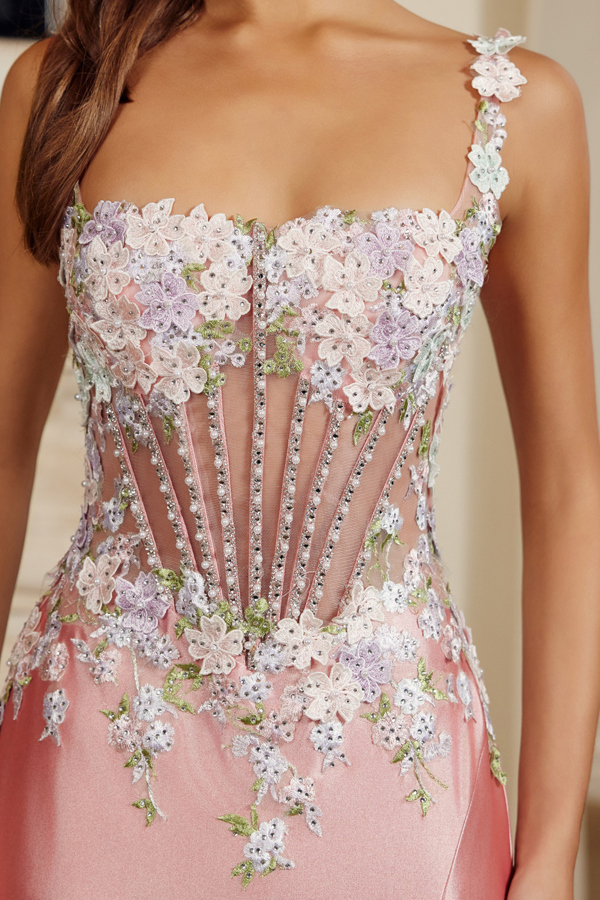 - 3D Floral Lace Applique Top Satin Evening Dress
