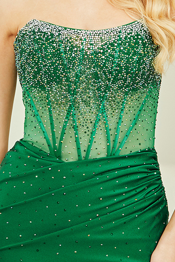 - Strapless Bateau Neckline Stone Detail Stretch Satin Dress 3107
