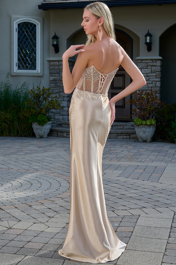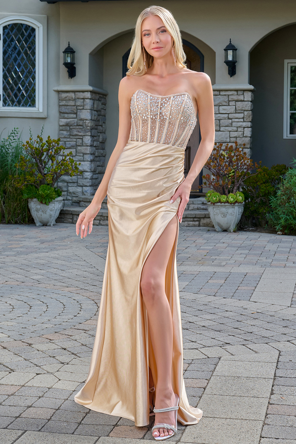 Sleek and sophisticated, fitted floor-length gown. The strapless, sheer corset bodice features a refined boat neckline, beautifully framed with beads. Sparkling jewels are scattered throughout the bodice, set over a glitter mesh underlayer for added dimension and shine. The minimalist stretch satin skirt balances the look with elegant side pleating and a daring thigh-high slit.