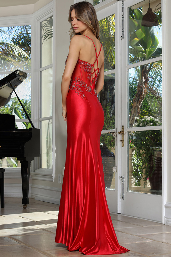 Color: RED Size:- Liquid Metallic Mermaid Gown with Pleated Bodice