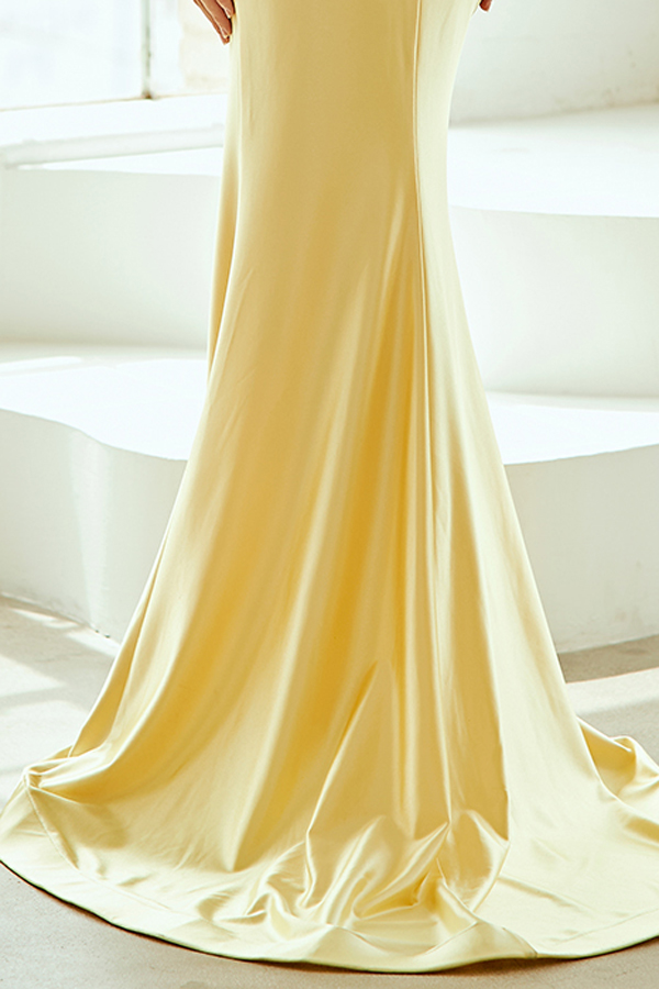 Strapless V Neckline Jewel Neckband Drape Satin Dress
