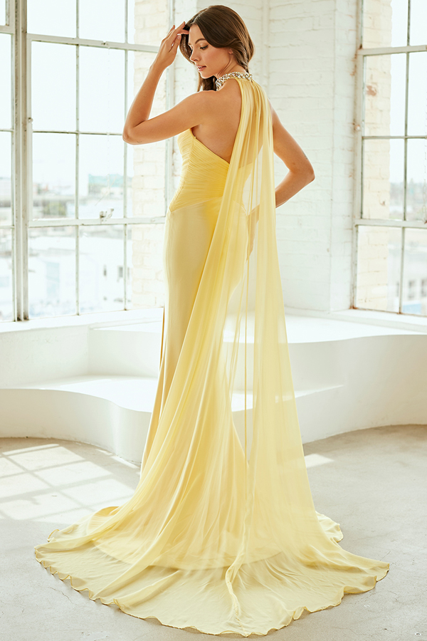 Features: Jewel Trimmed Neckline, Matching Heavy Jewel Neckband Sweep Length Chiffon Drape, Satin, Pleat Top, Ruched Back