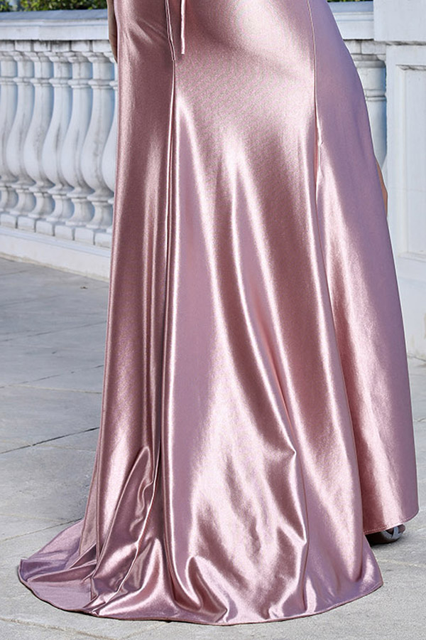 Satin Spaghetti Strap Lace Detail Plunging Neckline Long Evening Satin Dress.