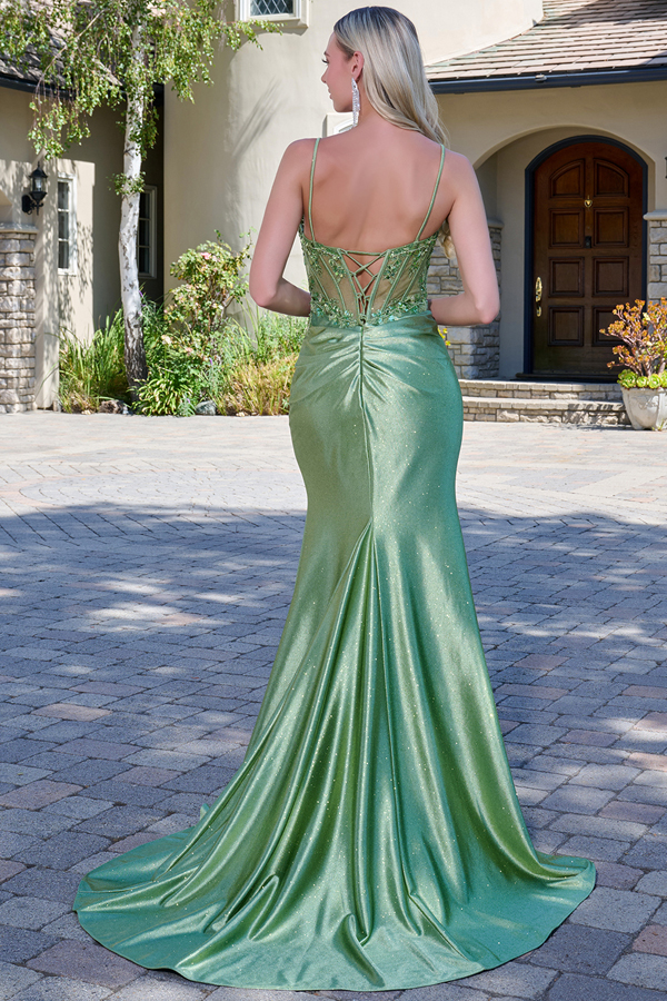 Fitted floor-length evening dress featuring delicate spaghetti straps and a V-neckline, mesh corset bodice. The bodice is adorned with 3D floral appliques, intricate embroidery, beads, and sequins. Glitter dot jersey fabric make up the pleated bust and sleek skirt. Side pleats on the skirt accentuate the silhouette and highlight the thigh-high slit, which is also embellished for added glamour. The back of the skirt features gathering.