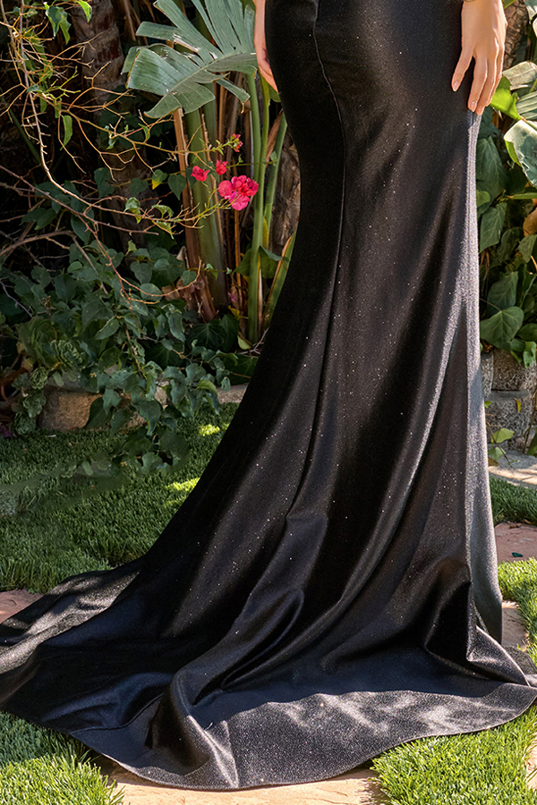Floor-length gown crafted from glitter-dotted jersey, it features pleated off-the-shoulder straps. The sheer, mesh bodice is shaped with a flattering V-neckline and detailed with intricate beading, sequins, and delicate embroidery. The bodice uses the same fabric as the straps to create pleated strips of fabric that are crossed over. The fitted skirt flows into a soft drape, with side pleating, back gathering, and a thigh-high slit.