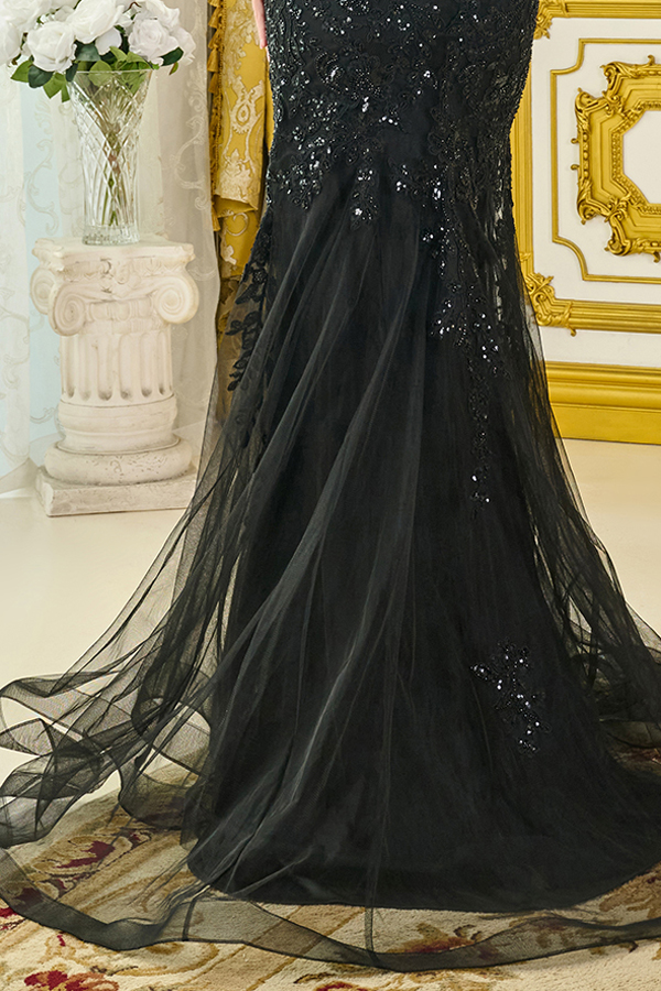 Elegant and alluring, this floor-length trumpet gown perfectly balances intricate detail with simplicity. Adjustable spaghetti straps support a sheer V-neck corset bodice, offering both comfort and a flattering fit. The fitted portion of the skirt is richly adorned with embroidery, sequins, and beads, creating eye-catching texture and sparkle. As the skirt flares out, the embellishments soften into a more minimalistic design.