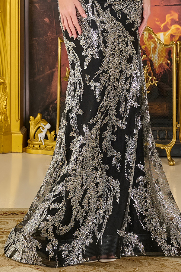 A vision of elegance, this fitted floor-length dress features a V-neckline corset bodice supported by adjustable spaghetti straps. Embroidered florals, beaded embellishments, sequins, and glitter combine to create a captivating, luminous look.