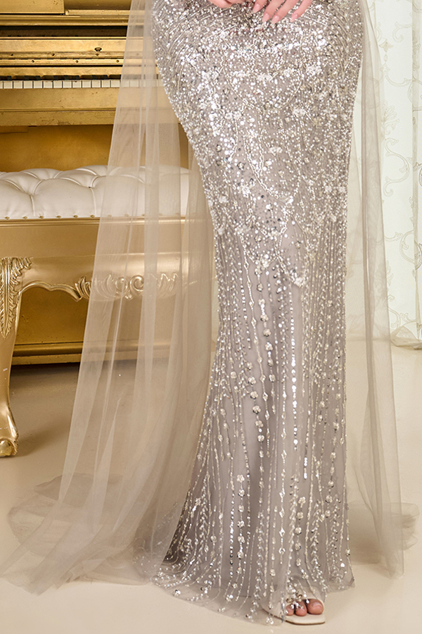 Color: SILVERA luxurious mother of the bride or groom gown is designed to make a lasting impression. Classic sweetheart neckline and richly embellished with intricate beading and shimmering sequins throughout. Elegant, detached off-the-shoulder long sleeves add a modern yet timeless touch. A zippered back ensures a seamless fit, while the look is completed with a matching capelet and a detachable mesh overskirt train.