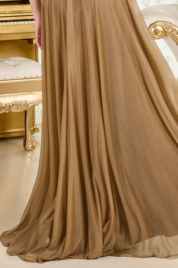 Floor-length A-line mother of the bride/groom dress showcases a beautifully detailed bodice adorned with intricate beadwork, shimmering sequins, and delicate appliques. The sheer, mesh bodice features boat neckline and 1/2 sleeves, offering elegant coverage. The skirt, crafted from lightweight metallic jersey, flows effortlessly and remains unembellished to highlight the artistry of the bodice. A discreet zip-up back ensures a smooth, secure fit.