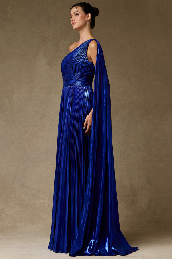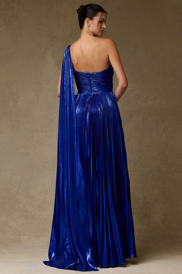 Color: ROYAL Size:One Shoulder Accordion Pleat Metallic Dress.