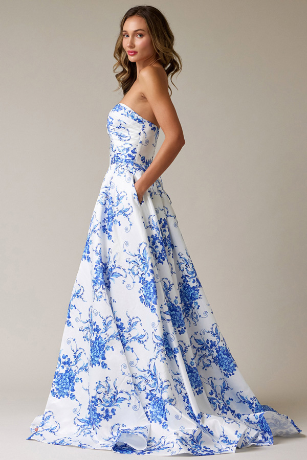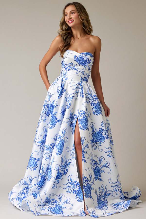- Strapless Pleat Detail Top Satin Print A Line Dress