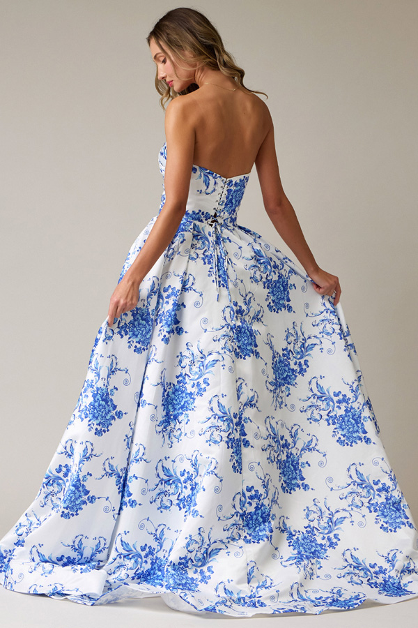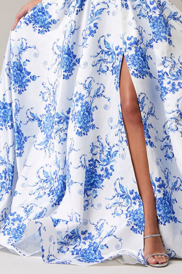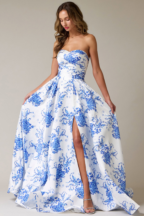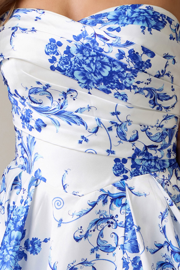 Strapless Pleat Detail Sweetheart Top Satin Print A Line Dress.