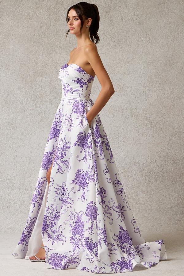 - Strapless Pleat Detail Top Satin Print A Line Dress