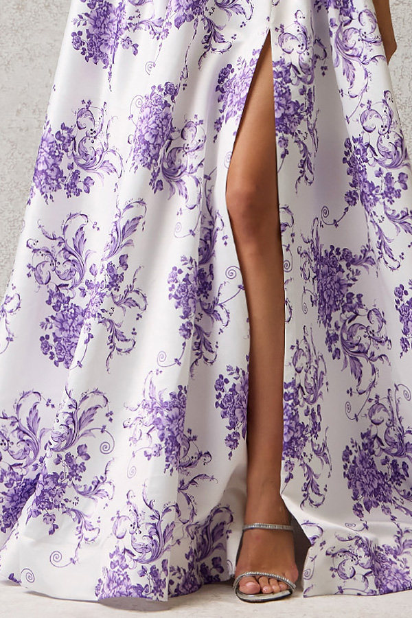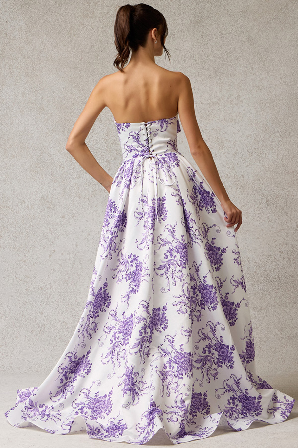Strapless Pleat Detail Sweetheart Top Satin Print A Line Dress.