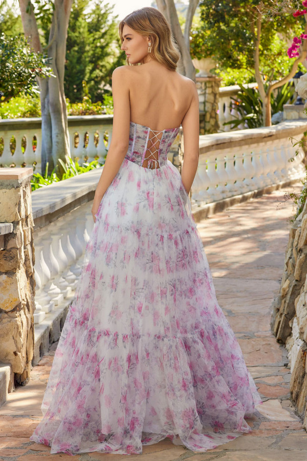 - Strapless Sweetheart Pleated Floral Pattern Dress