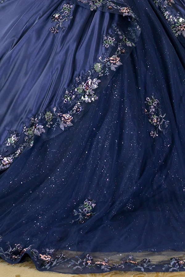 Quinceanera ball gown features refined details and luxurious fabrics. Pleated off-shoulder straps frame a deep V-neckline corset bodice. The design is adorned with floral embroidery and shimmering sequins that add a touch of sparkle. A sleek, satin overskirt parts in the back to reveal a glittery mesh train beneath, creating a dramatic contrasting look. Completing the look, a detachable satin bow accents the back for a picture-perfect finish.