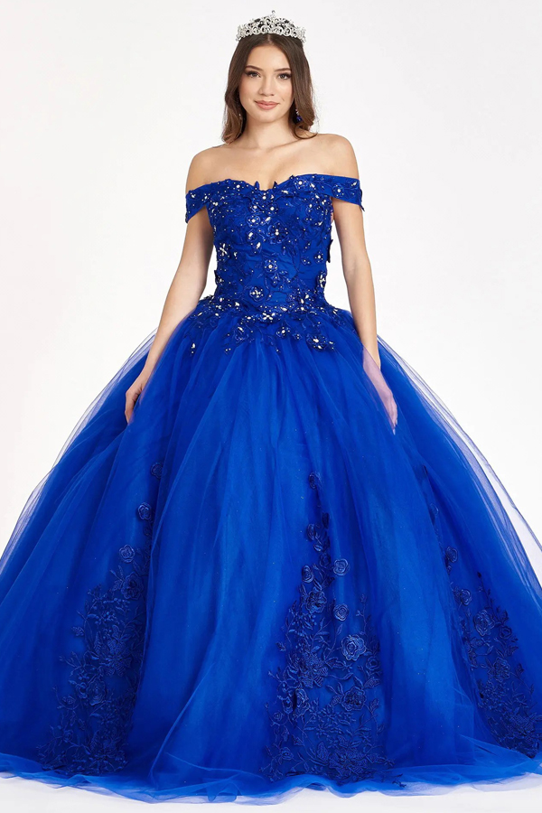 Floral Embroidery and Jewel Embellished V-Neck Mesh Ball Gown