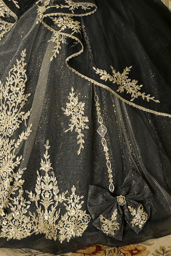 Featuring embellished off-the-shoulder straps accented with dangling beads. The V-neckline, corset bodice is decorated with embroidery, beads, sequins, and radiant jewels. A layer of champagne-colored glitter mesh beneath the tulle adds a soft, luminous glow. The voluminous skirt showcases cascading ruffles edged in elegant scalloped embroidery. Detachable back bow adds a playful yet elegant touch, while miniature bows are delicately placed along the hem.