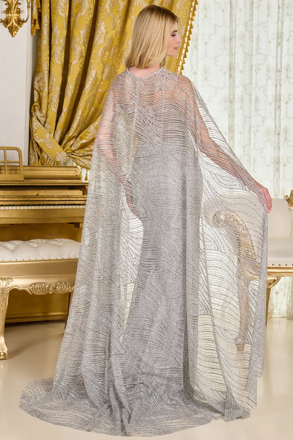 Fitted, floor-length gown lavishly adorned with beads, jewels, sequins, and glitter. Delicate spaghetti straps frame a deep, V-neckline corset bodice that enhances the figure, while the Basque waistline flows into a beautifully embellished skirt patterned with wave designs and a thigh-high slit. A matching cape drapes gracefully over the shoulders, adding a dramatic and elegant finishing touch.