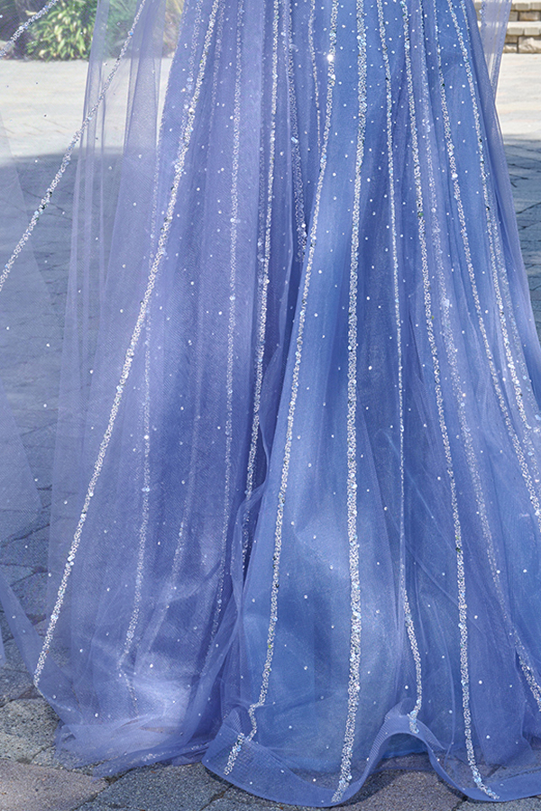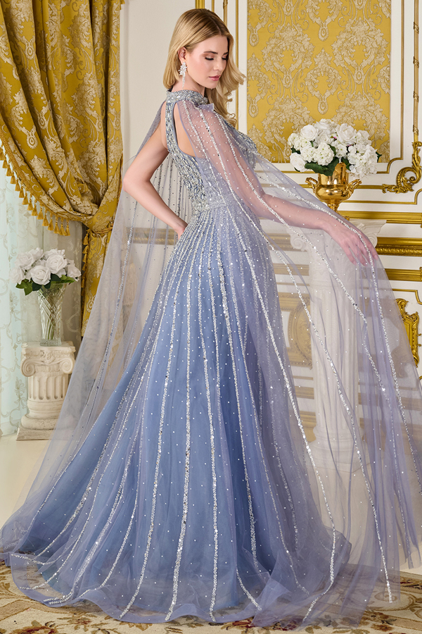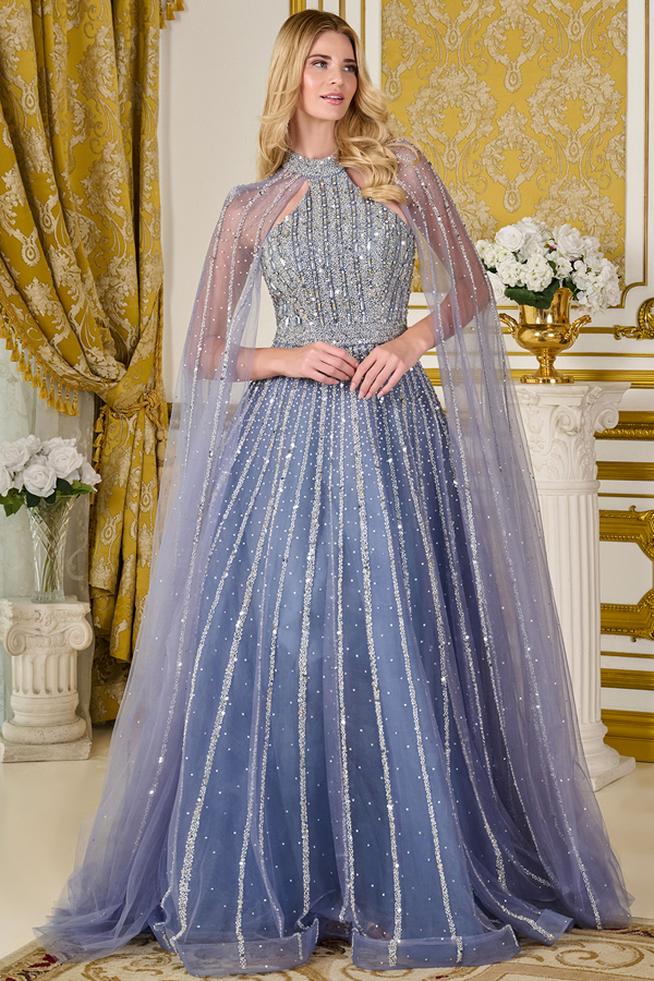 A-line floor-length gown designed to make a statement at any formal event. This dress features a mock halter neckline paired with elegant raglan cape sleeves. Intricately adorned with shimmering beads, sequins, and jewels, the gown sparkles with every movement. A concealed zipper at the back ensures a seamless and flattering fit.