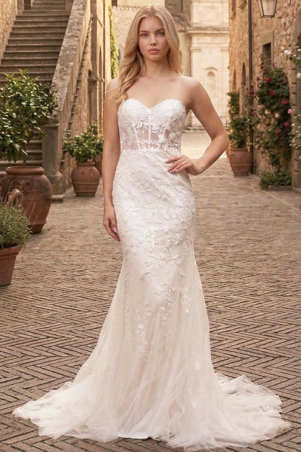 Strapless Sweetheart Boned Top Botanic Lace Mermaid Dress.