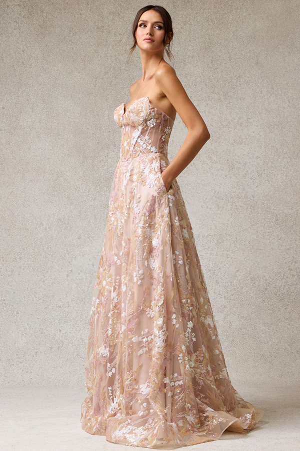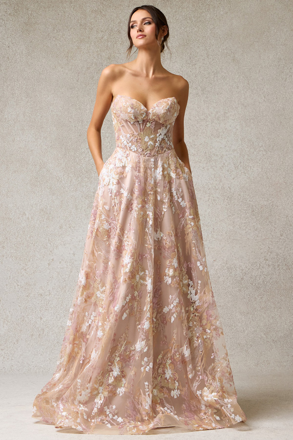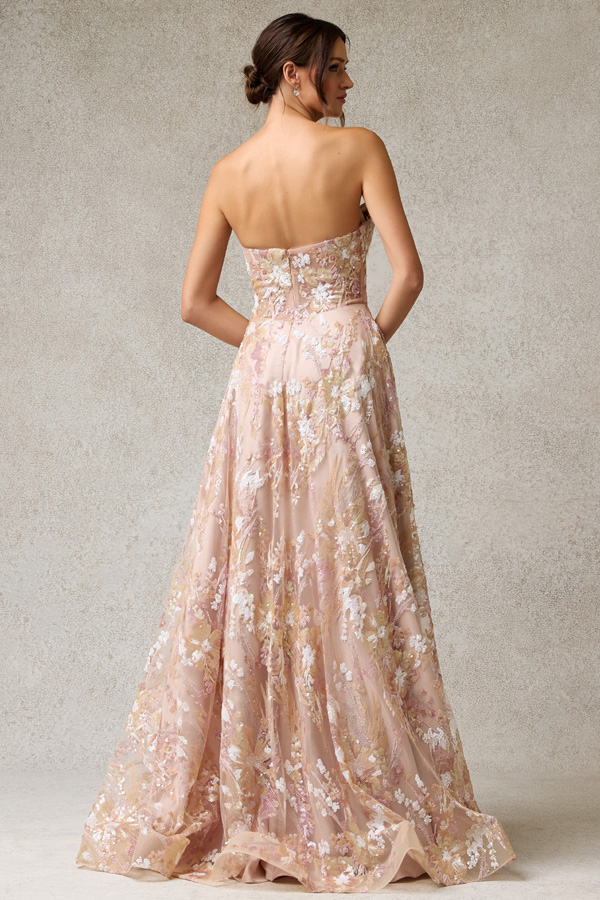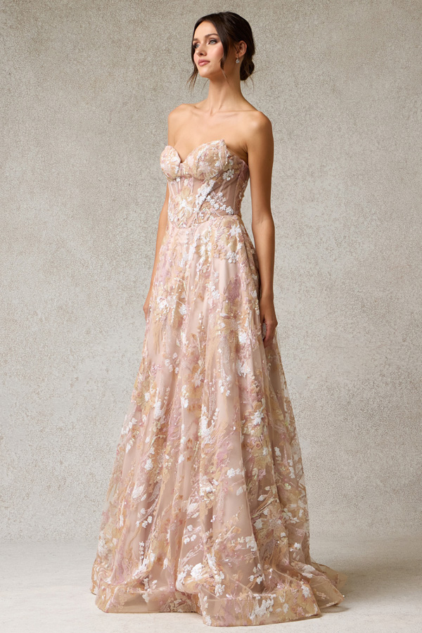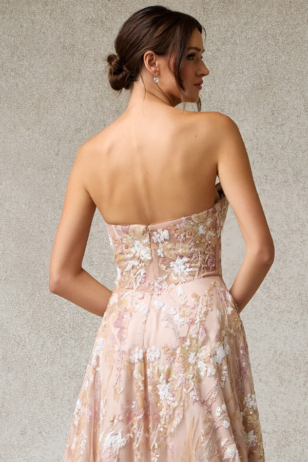 Embellished Strapless Sweetheart A Line Dress w/ Sequin Embroidery over Tulle.