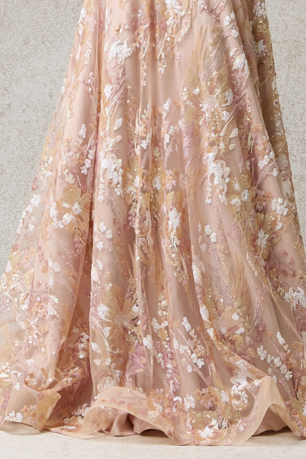 Features: Sweep Length, Veiled Waistline, Sequin Embroidery Applique, Open Back, Zipper.